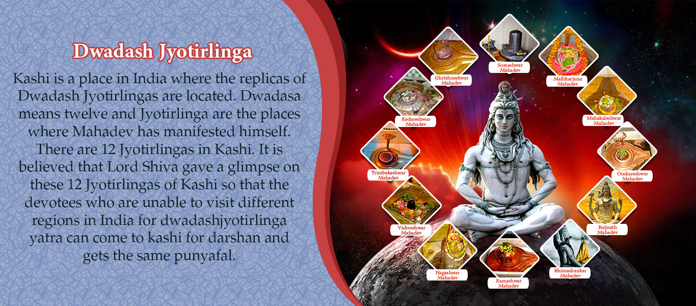 Kashi is a place in India where the replicas of Dwadash Jyotirlingas are located. Dwadasa means twelve and Jyotirlinga are the places where Mahadev has manifested himself. There are 12 Jyotirlingas in Kashi. It is believed that Lord Shiva gave a glimpse on these 12 Jyotirlingas of Kashi so that the devotees who are unable to visit different regions in India for dwadashjyotirlinga yatra can come to kashi for darshan and gets the same punyafal. Here, Lord Shiva was established with the hands of Swayambhu and Lord Ganesh in the form of 12 Jyotirlingas. Baba Vishwanath is one of the Dwashash Jyotirlingas, and the replicas of other original Jyotirlingas are also located here in Varanasi.